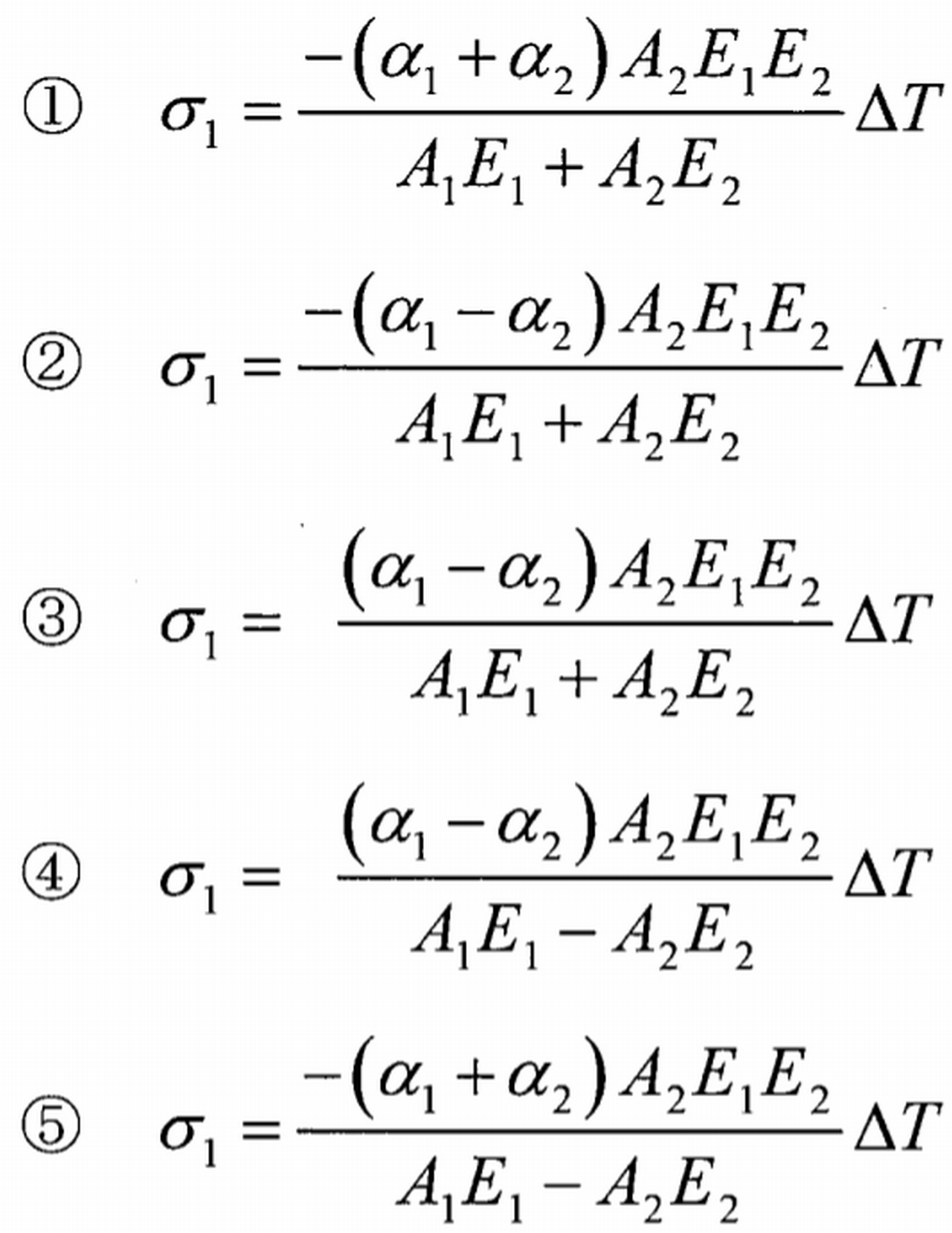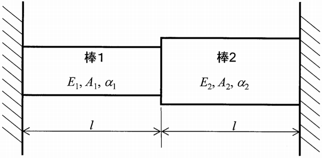 下図に示すように, 長さがlの棒1 と棒2が接合され, 剛体壁に取り付けられている。棒1と棒2の縦弾性係数をE1, E2,断面積をA1, A2,線膨張係数をα1, α2とする。棒の温度を微小量△Tだけ上昇させたとき,棒1に発生する応力σ1として,最も適切なものはどれか。