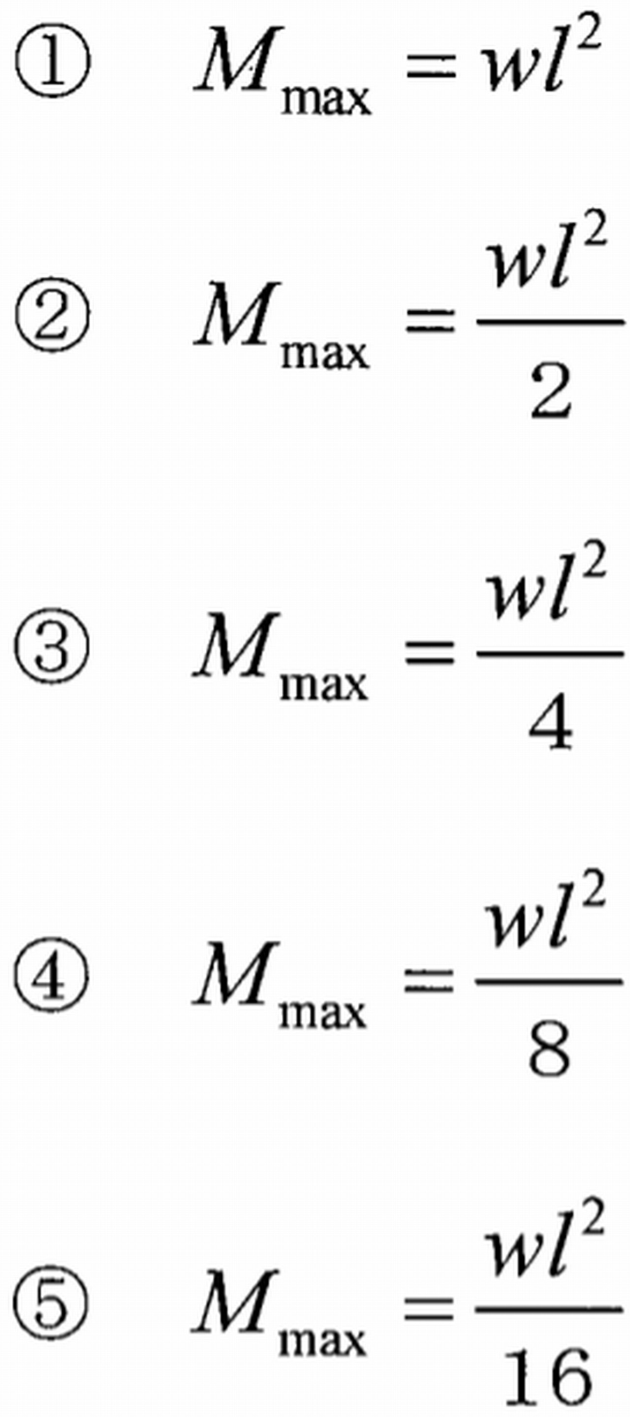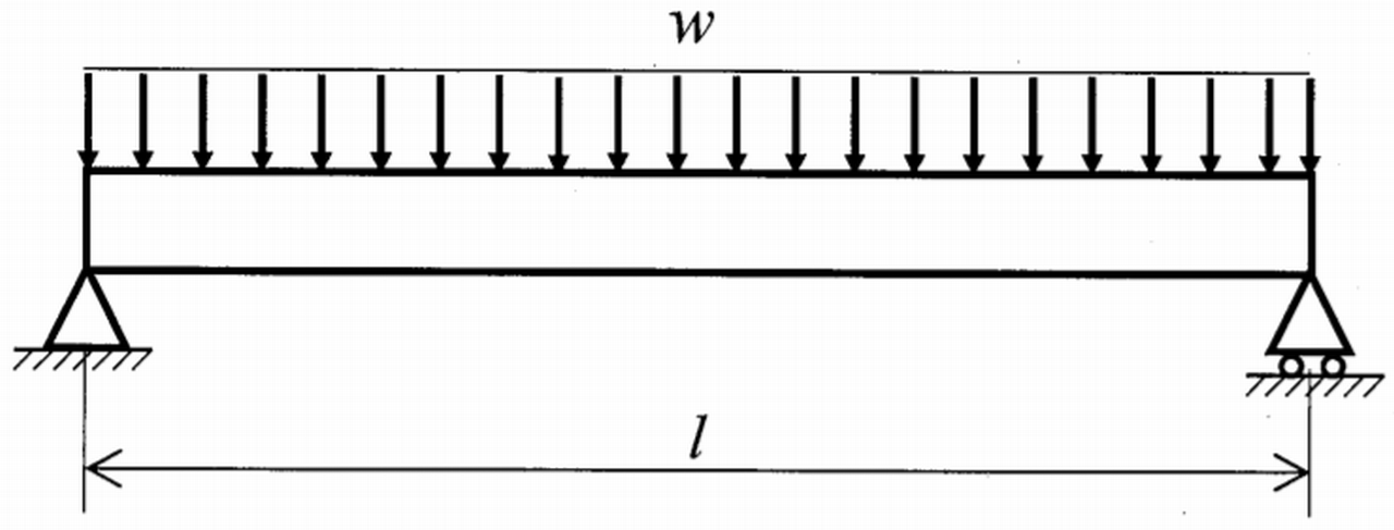 下図に示すように, 一様断面の長さlの単純支持はりに等分布荷重wが作用している。はりの最大曲げモーメントMmaxとして,最も適切なものはどれか。