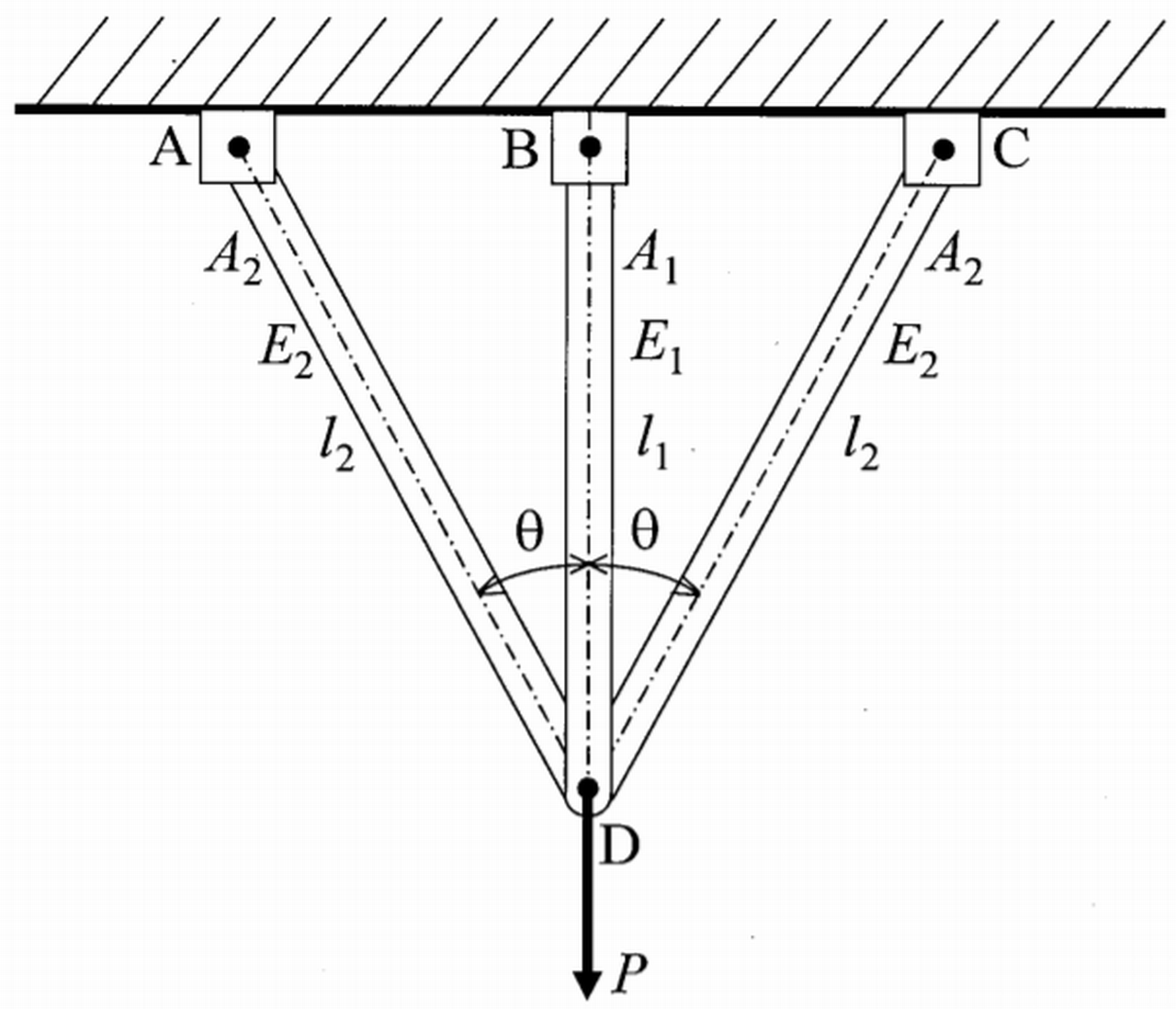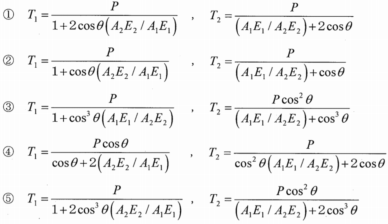下図に示すように, 3本の棒AD, BD, CDからなる.トラス構造において, 棒BDはヤング率E1, 断面積A1, 長さl1, 棒ADとCDは同じヤング率E2, 同じ断面積A2,同じ長さl2であり, 左右対称である。 また, 棒ADと棒BDのなす角度と棒CDと棒BDのなす角度は共にθである。 D点に下向きの力Pが作用するとき, 棒BDに生じる軸力T1と棒AD, CDに生じる軸力T2の組合せとして, 最も適切なものはどれか。